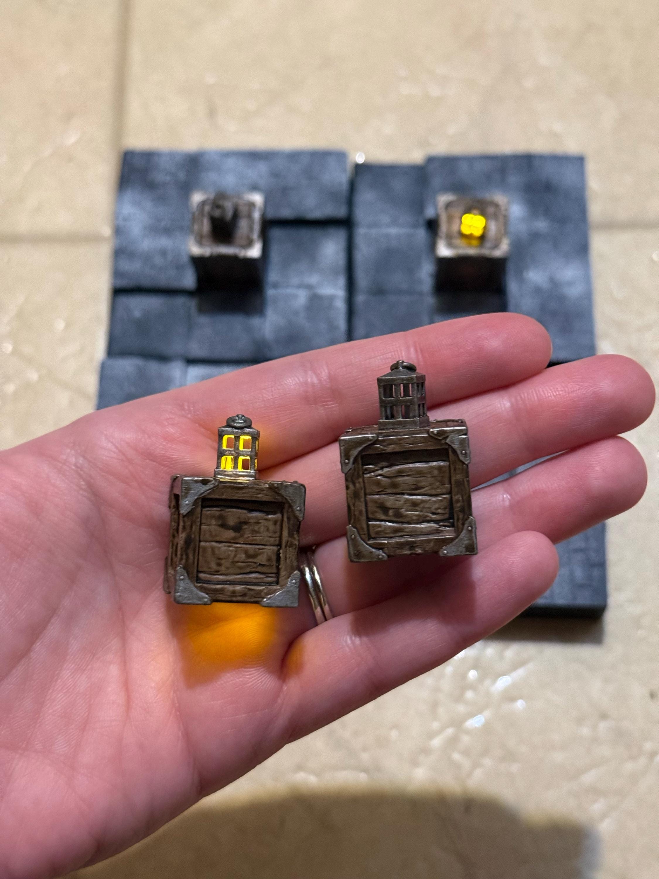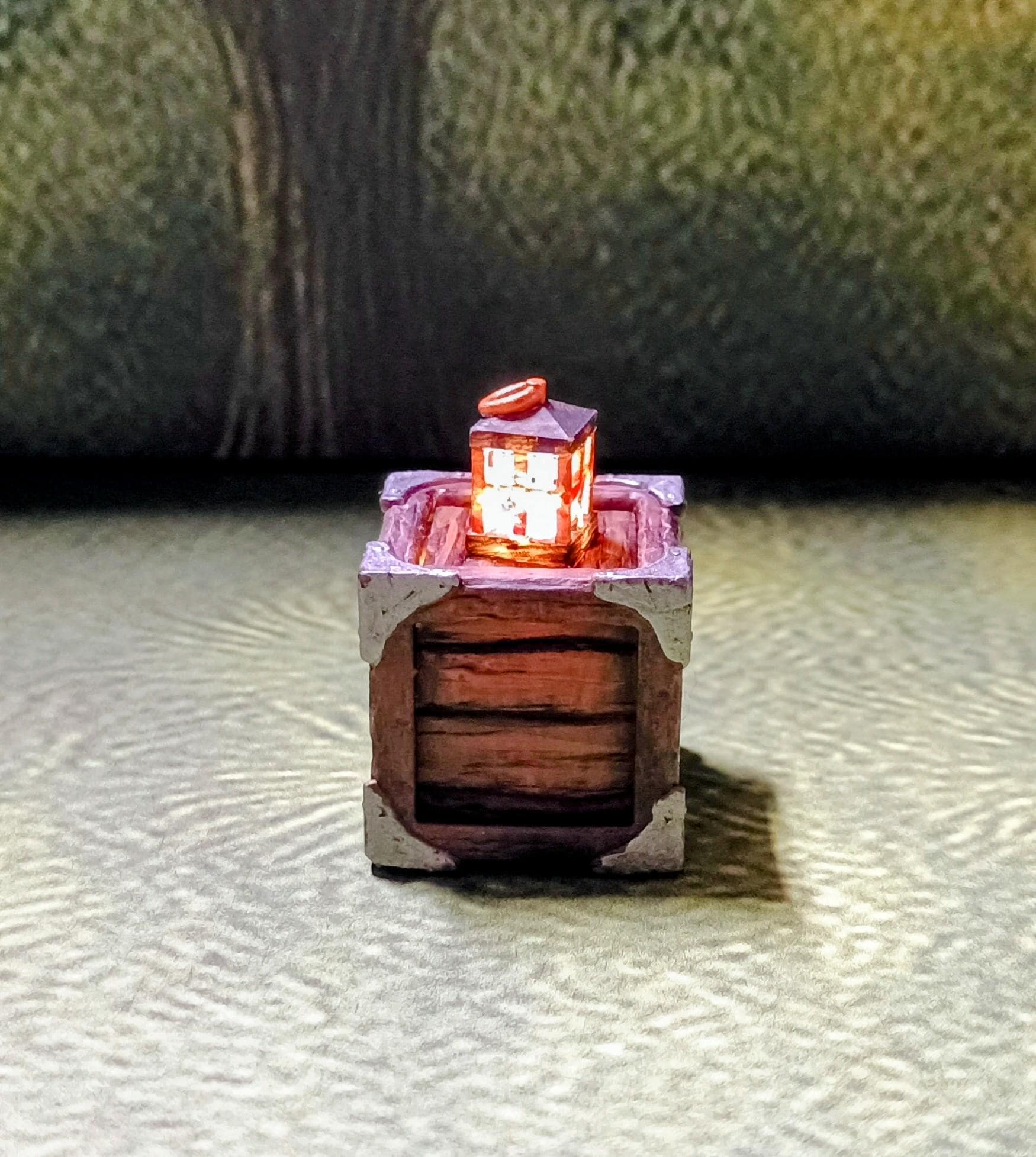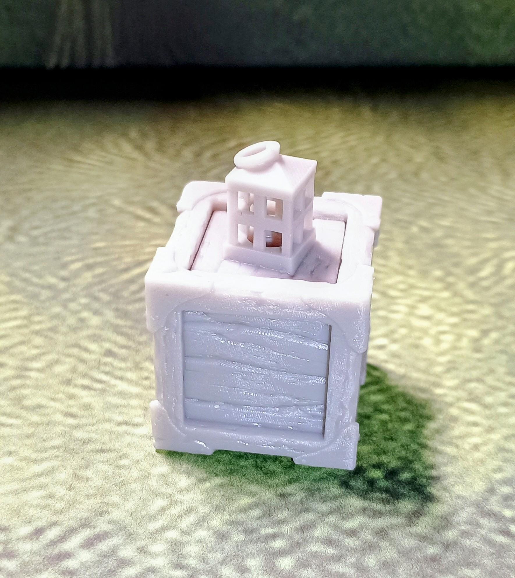 Bring your tabletop world to life with this unpainted unpainted Latern on a Crate with LED. Expertly 3D‑printed for crisp detail, this piece adds dramatic illumination to your fantasy scenes, giving your TTRPG, wargame or diorama that extra spark.