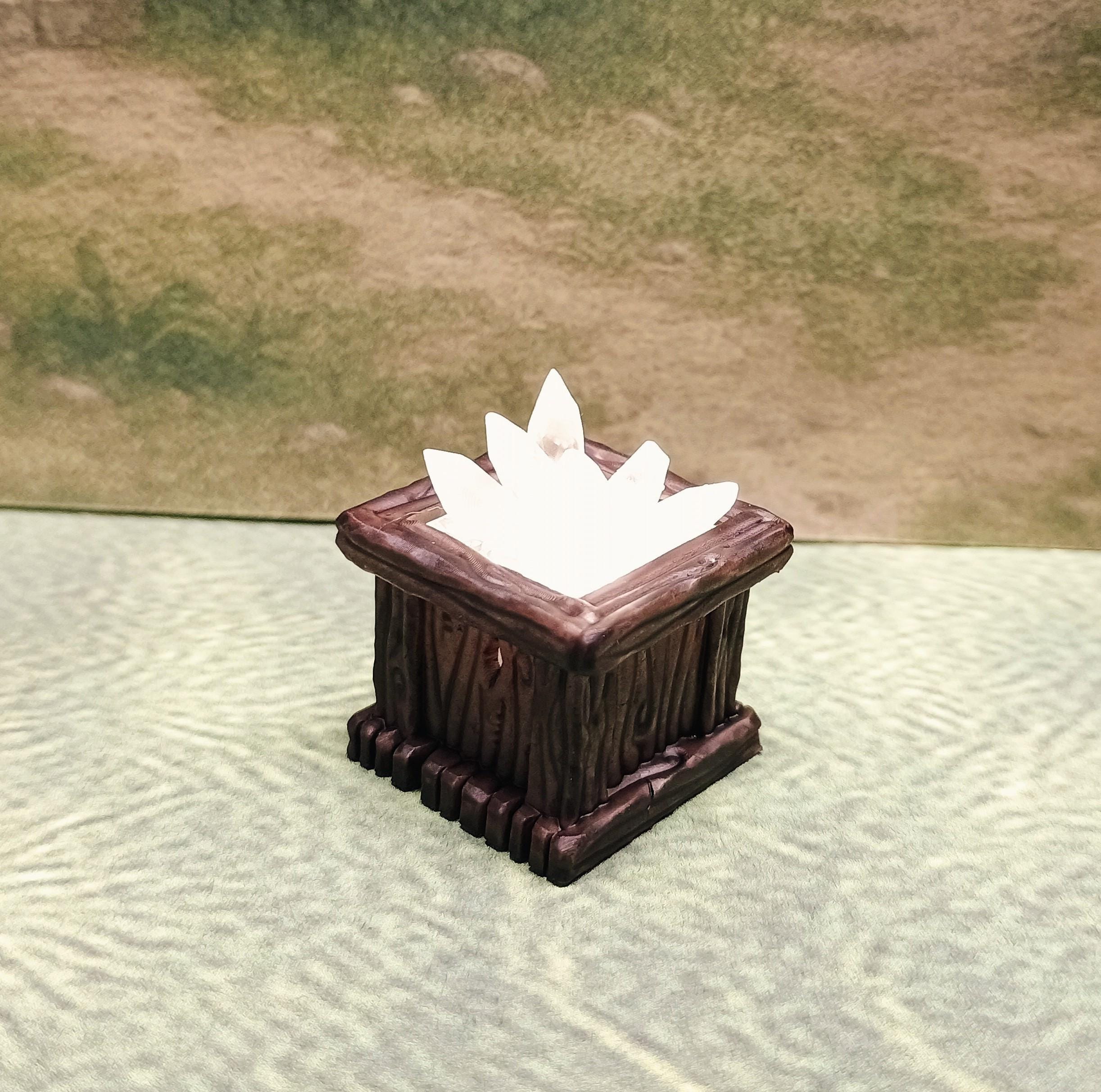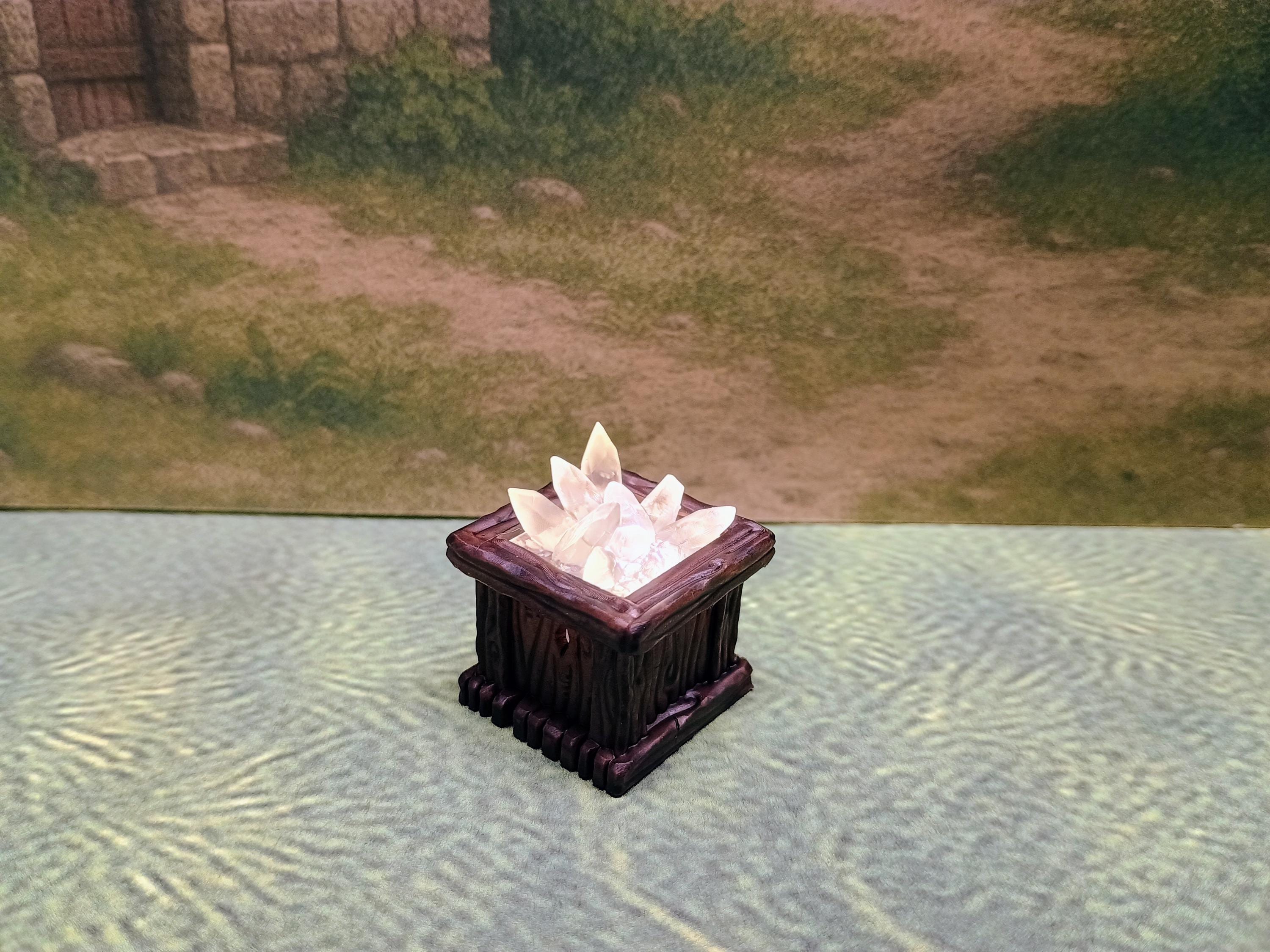 Bring your tabletop world to life with this unpainted unpainted Crate of Crystals with LED. Expertly 3D‑printed for crisp detail, this piece adds dramatic illumination to your fantasy scenes, giving your TTRPG, wargame or diorama that extra spark.