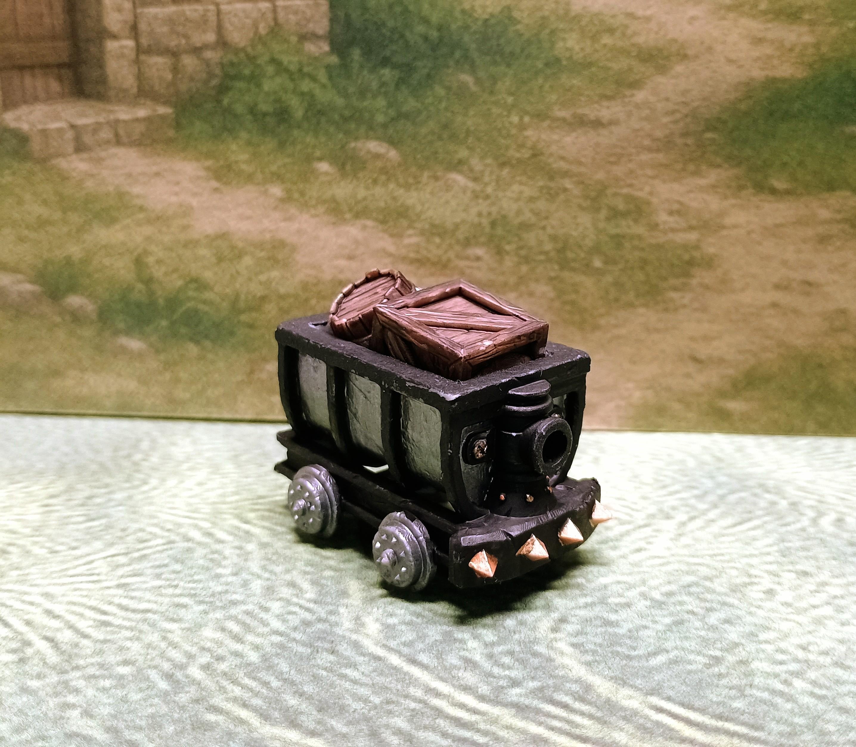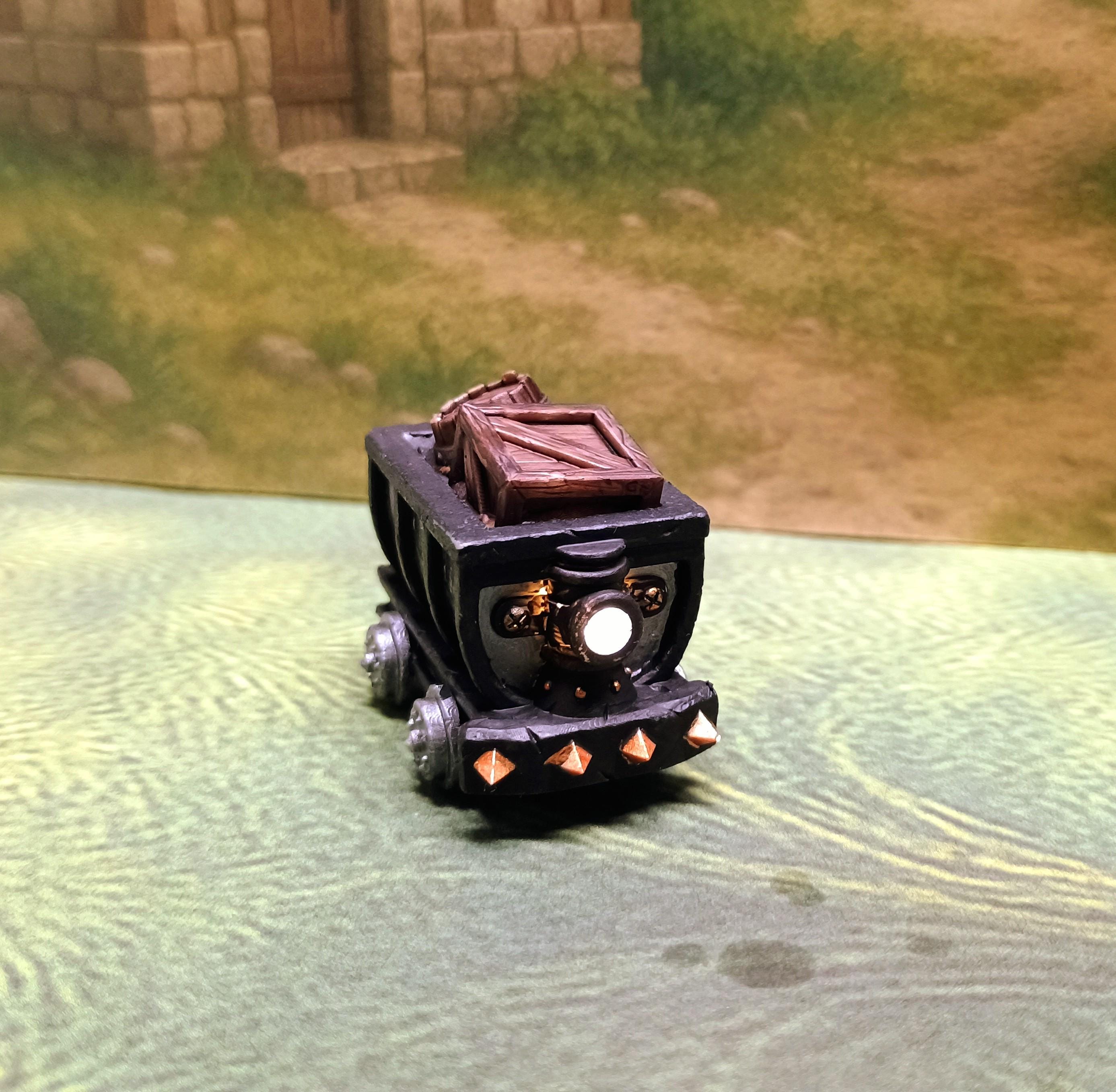 Brighten your tabletop scene with this elegant Minecart with LED light. This finely 3D printed terrain piece adds ambiance and character — perfect for fantasy mines and dungeons