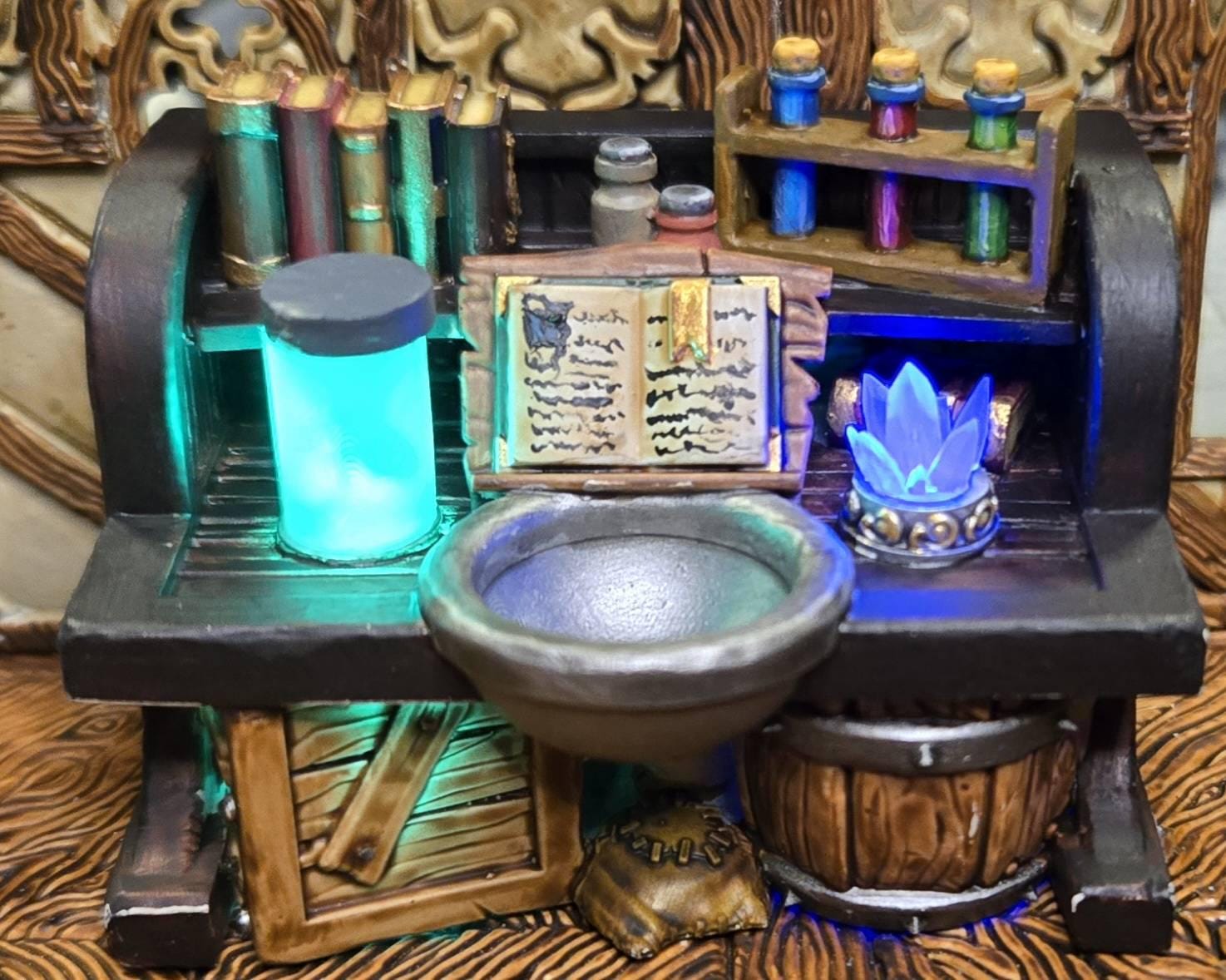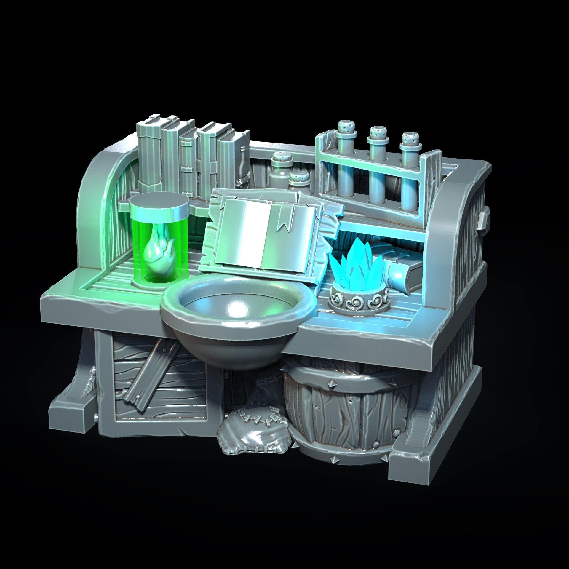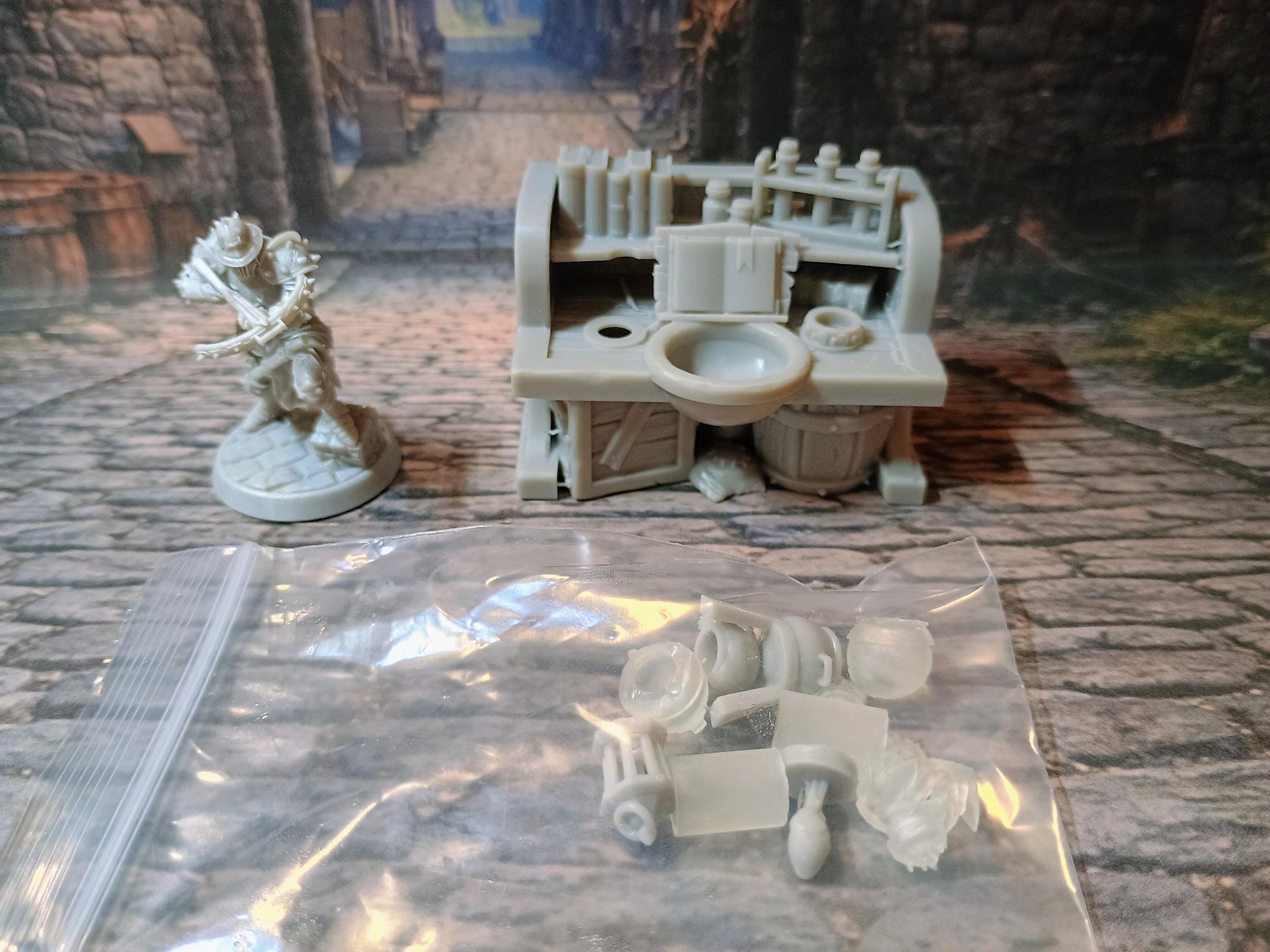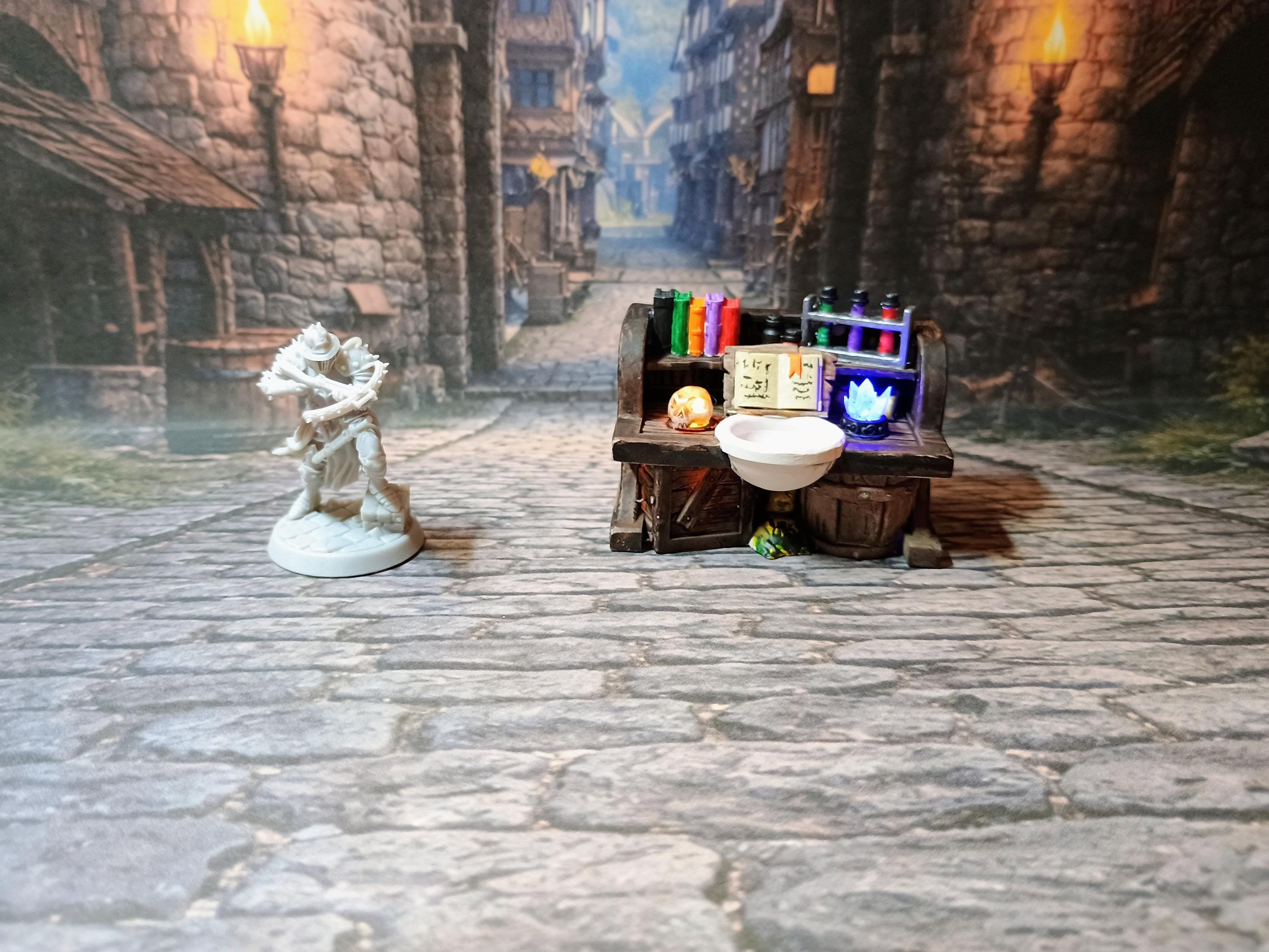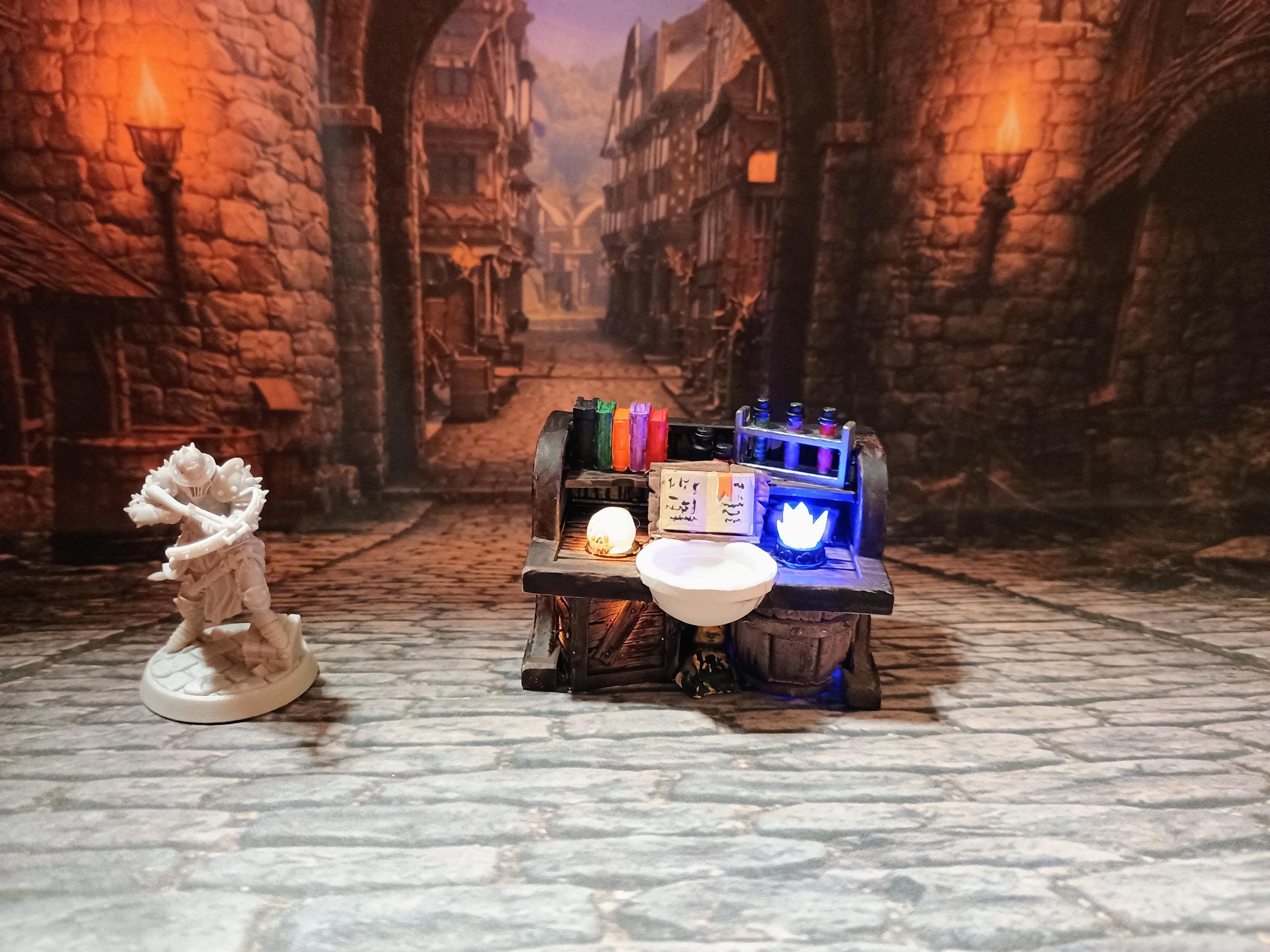 Add warmth and atmosphere to your tabletop builds with this detailed unpainted Alchemist Table with LED light. This 3D printed terrain piece is perfect for cozy taverns, rustic cottages, or dwarven halls, bringing your fantasy world to life.