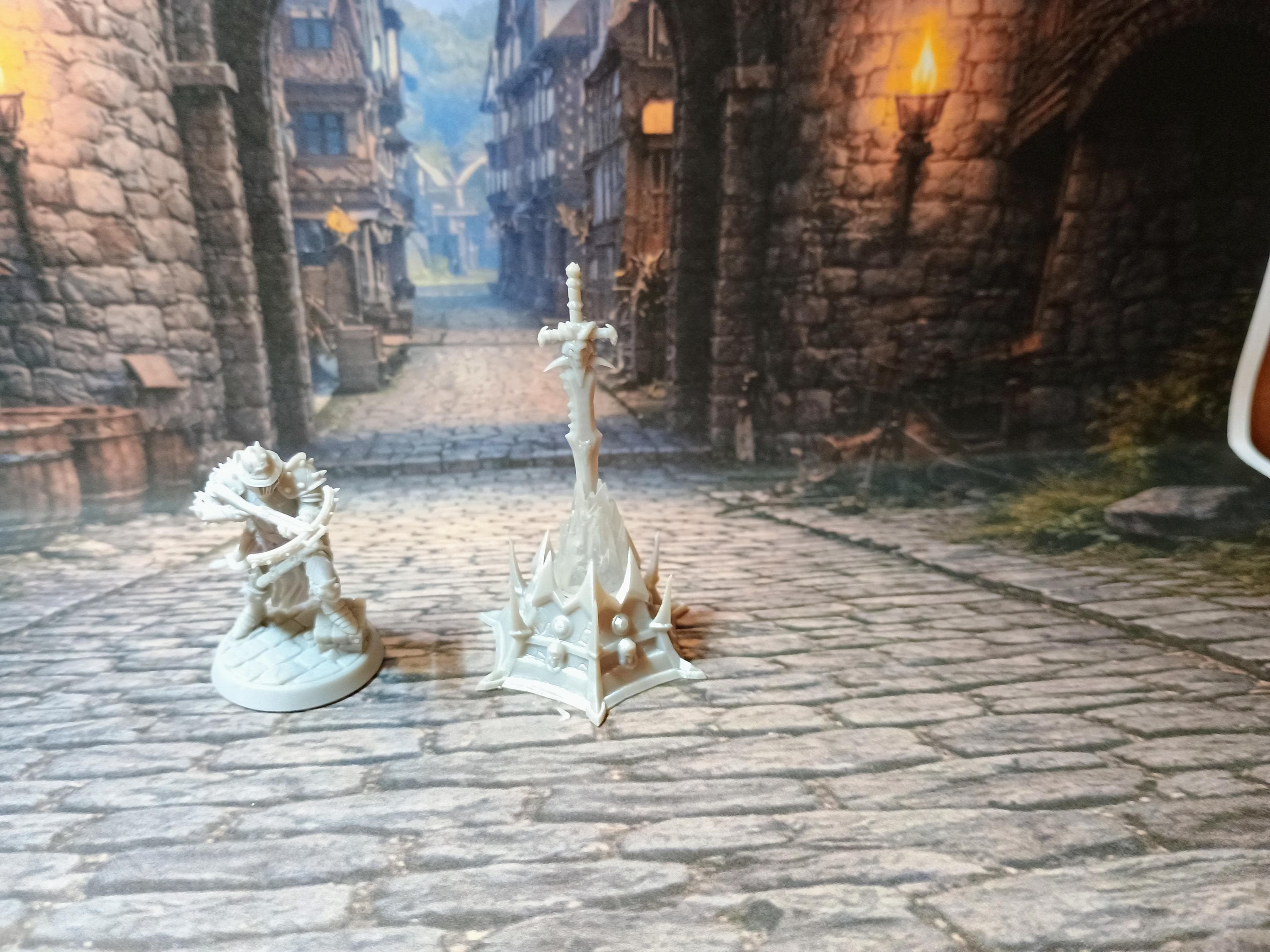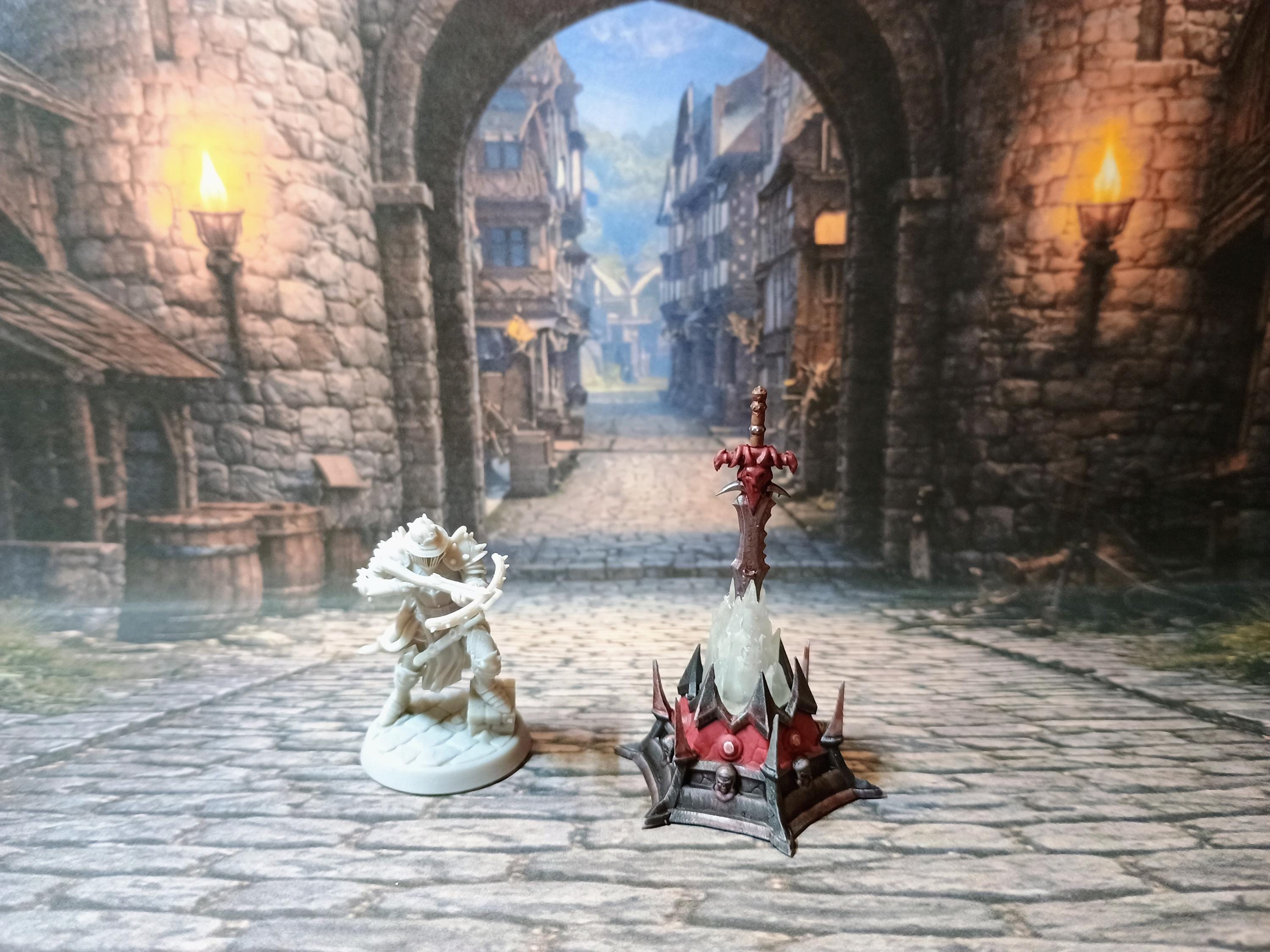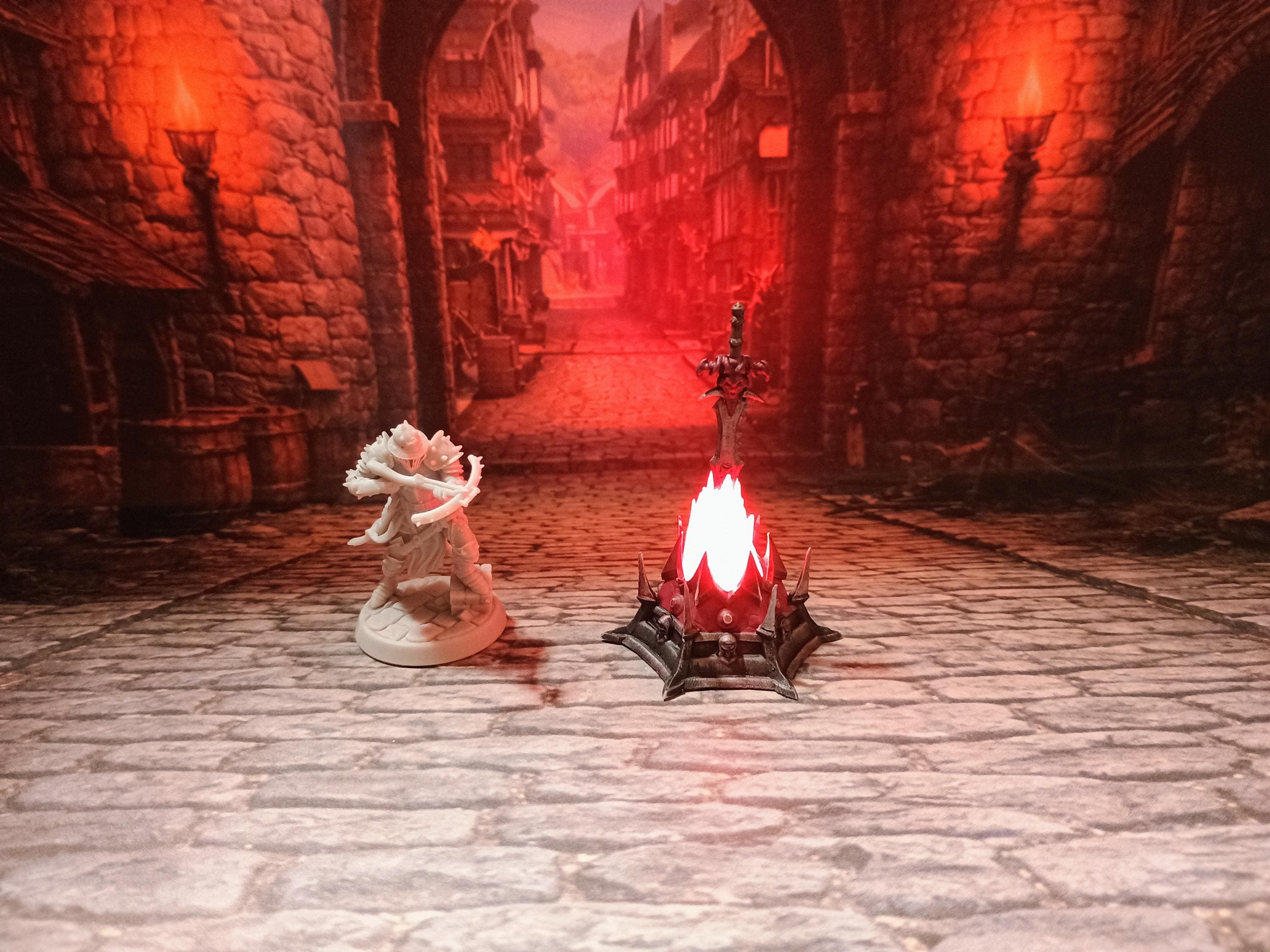 Add warmth and atmosphere to your tabletop builds with this detailed unpainted Cursed Sword with LED light. This 3D printed terrain piece is perfect bringing your fantasy world to life.