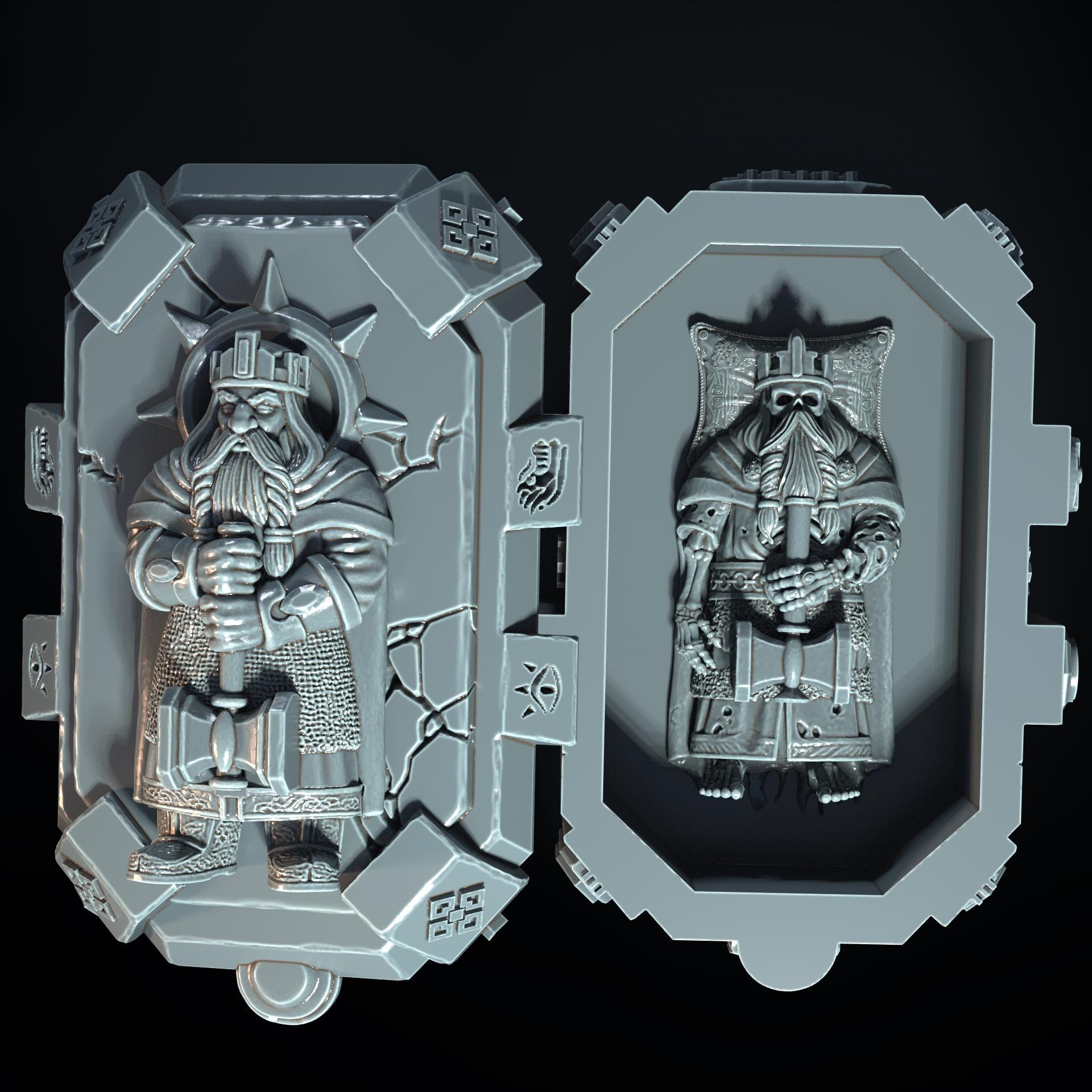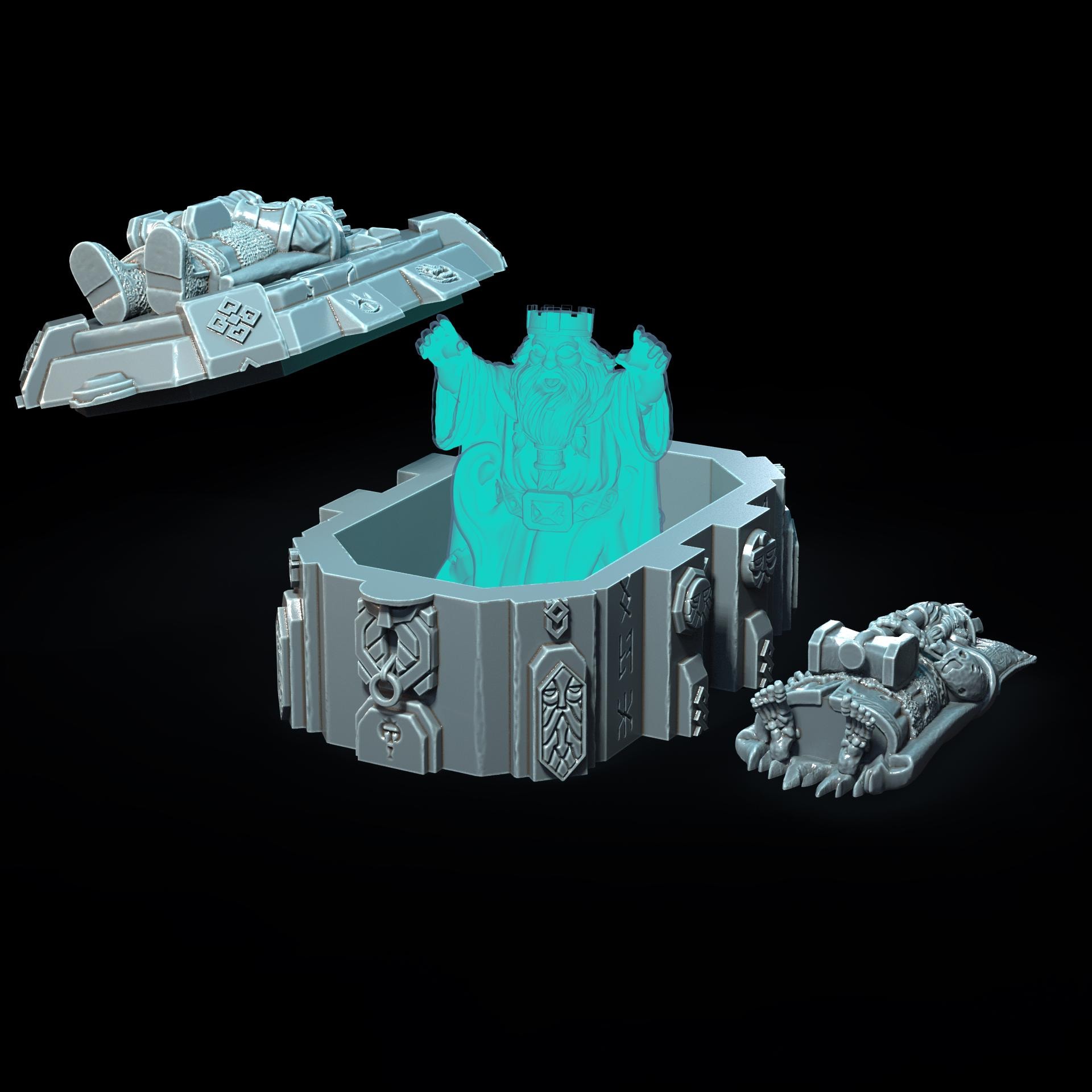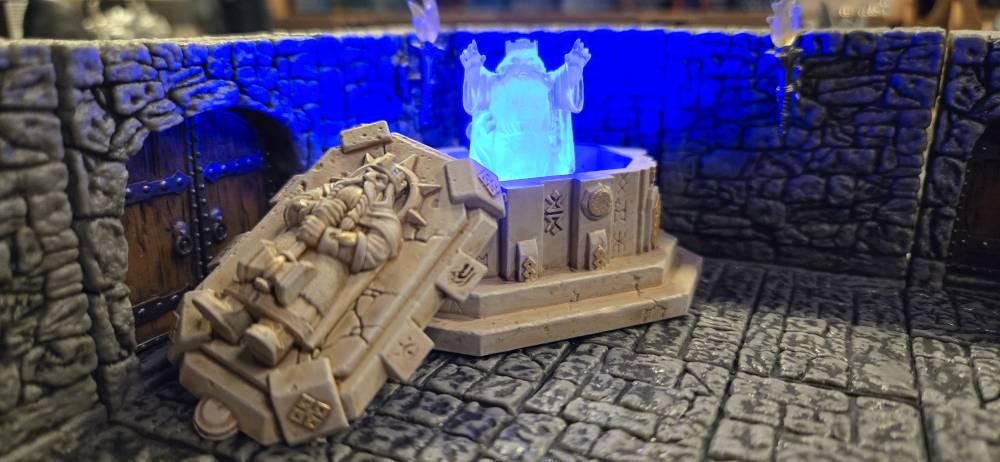 Bring your tabletop world to life with this stunning unpainted tomb of the dwarf king with LED . Expertly 3D‑printed for crisp detail, this piece adds dramatic illumination to your fantasy scenes, giving your TTRPG, wargame or diorama that extra spark.